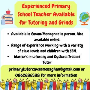 Experienced primary school teacher available for tutoring and grinds after school hours. Masters in Literacy. Dyslexia Ireland Tutor. Please contact me for more information......
